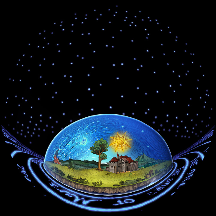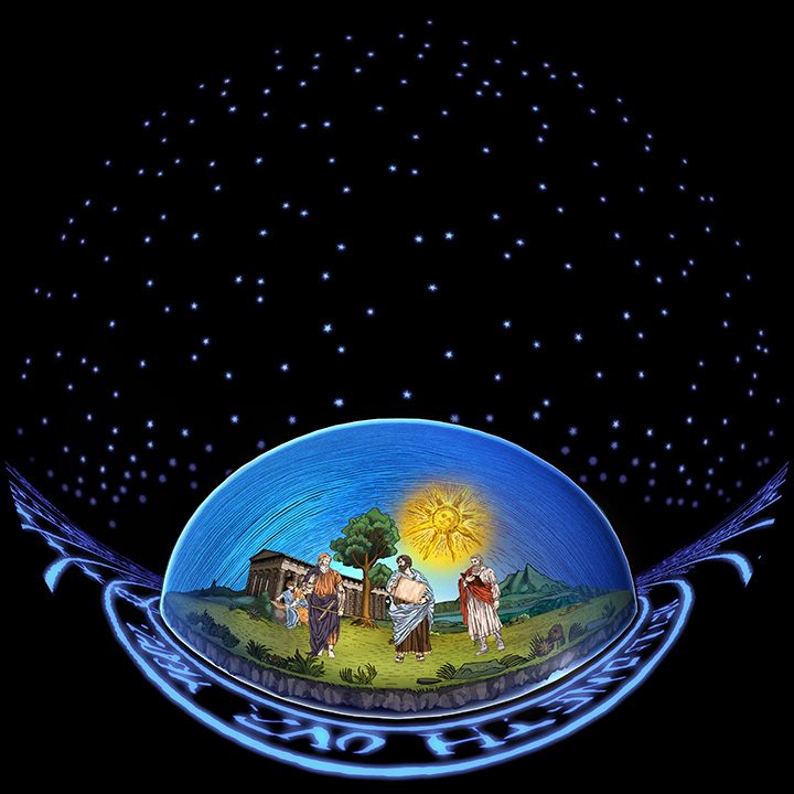 천동설을 믿던 시대의 사람들의 세계를 '우물안 개구리' 처럼 묘사하고, 그 세 등장인물인 플라톤, 아리스토텔레스, 그리고 프톨레미는 르네상스 시대 라파엘로의 그림 아테네 학당을 패러디해서 그렸습니다.