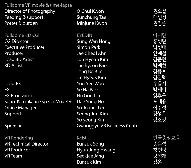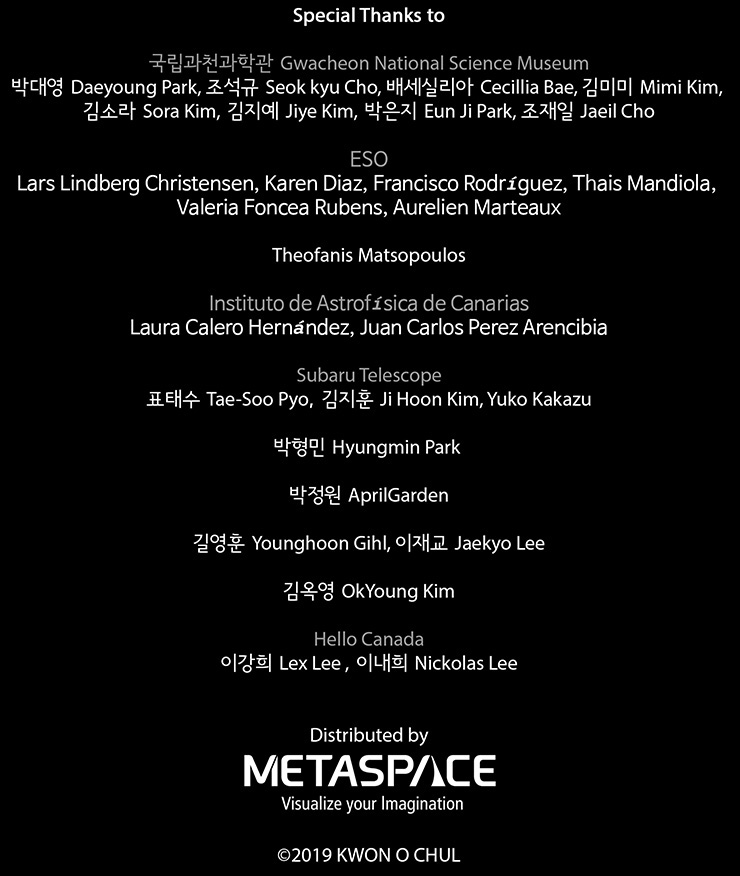 이외에도 과학책방 갈다 이명현 박사님, 노원우주학교 이정규 관장님, 한국천문연구원의 안상현 박사님이 과학자문을. 김수진님이 음악감독을, 조계환님이 사운드 마스터링을, 딥스카이 촬영은 카이스트 오준호 교수님과 정병준님이, 포스터 작업은 길영훈 선생님과 굿플의 이재교 대표님이 도와주셨어요... 그외에도 수많은 분들이 도와주셨어요.