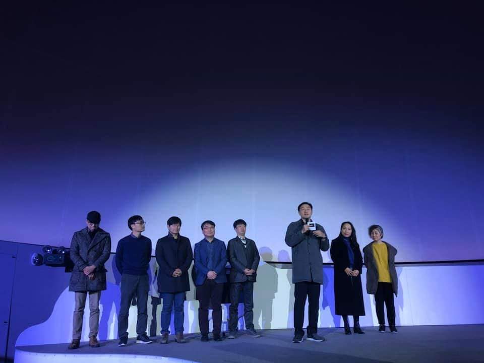 제작진 인사 시간. 사진은 이진주 (Jin Joo Lee)님 페북서 퍼옴. 왼쪽부터 시뮬레이션 담당한 메타스페이스의 김성근님, 과학자문을 맡아주신 천문연구원의 황호성 박사님, 서울대학교 천문학과 윤성철 교수님, 서대문자연사박물관 이강환 관장님, CG 담당하신 아이딘의 홍성완 감독님, 애니메이션을 담당하신 크리에이티브 섬의 조혜승 감독님, 시나리오 자문을 해주신 김옥영 선생님.