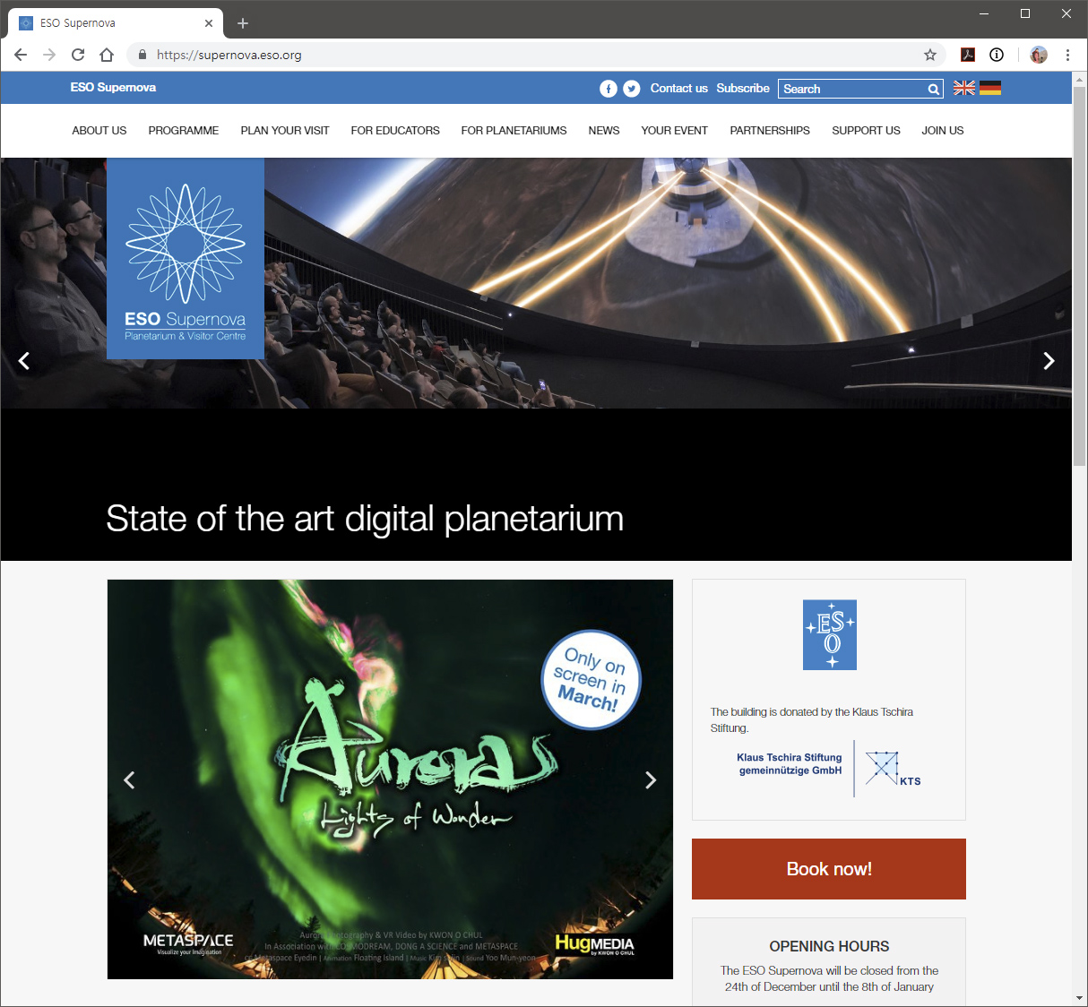 ESO에서 독일 뮌헨에 설립한 Supernova 플라네타륨에서 3월 한 달 동안 <생명의 빛 오로라>를 상영하고 있습니다.